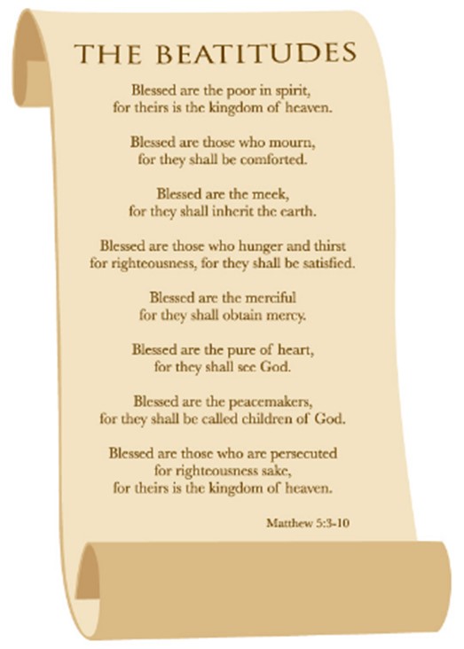 For those not familiar with The Beatitudes I’ve attached a scroll listing them. Or better yet, you can find them in your Bible, Matthew 5:3-10. Matthew 5:1-2 informs us that the Beatitudes were the foundation of Jesus’ Sermon on the Mount where he taught his disciples and the crowds. They are 8 simply stated, yet profound guidelines Jesus revealed. I humbly see The Beatitudes representing how we, the People of God, strive to be blessed, morally and spiritually as disciples of Jesus.