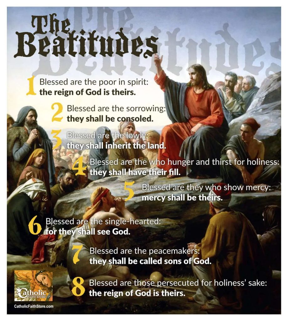 For those faithful servants like me who are enlightened by exploring the foundation of our faith, here is a link where you can gain a deeper understanding of each of the 8 Beatitudes: The Meaning of The Beatitudes — The Key to Happiness. As written in Mathhew 5:3-10, below are the 8 Beatitudes (source: United States Conference of Catholic Bishops).